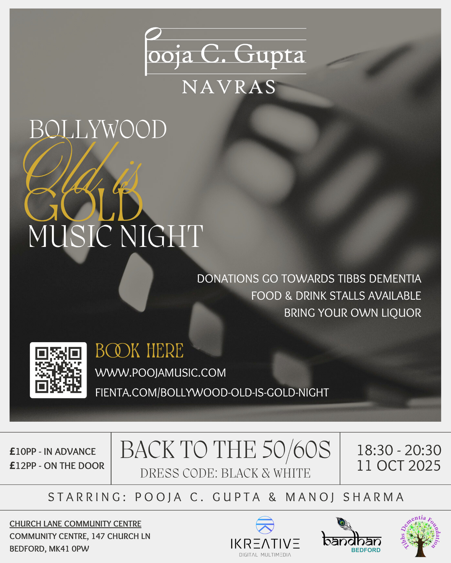 Join me on the 11th Oct 2025 from 6.30 till 8:30pm for live 50/60s Bollywood singing, food, drinks, raffle and Music Masti. See you there!